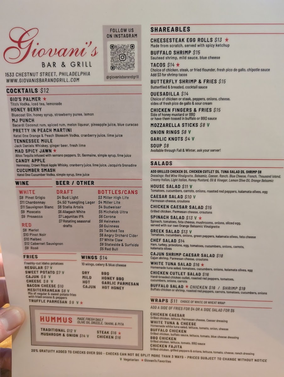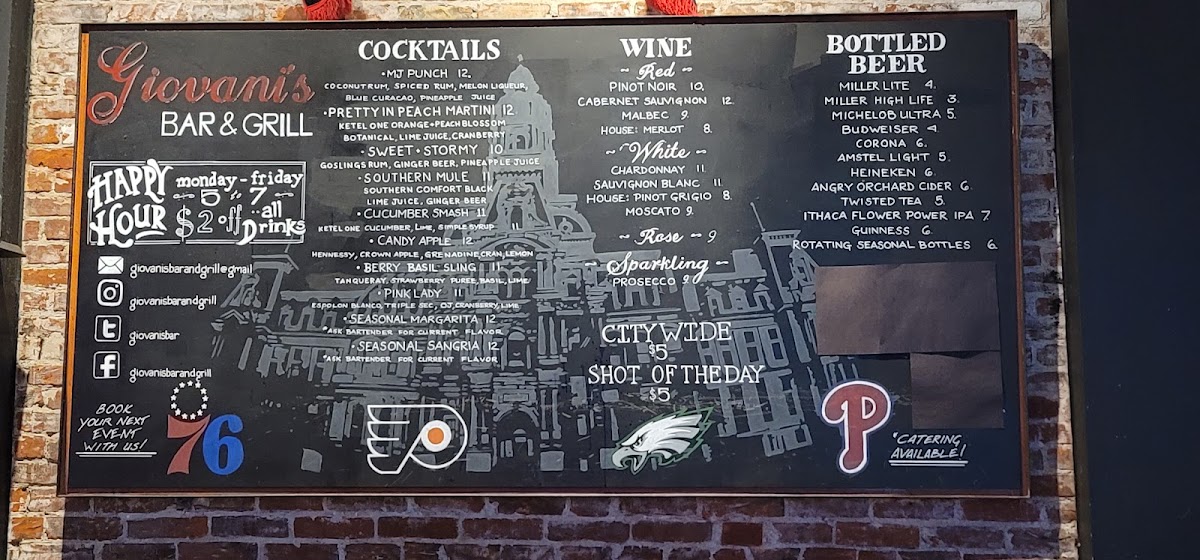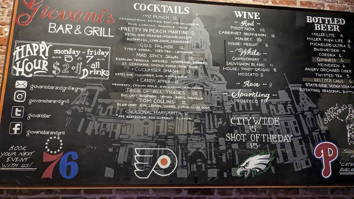 Step into Giovani's Bar & Grill, an authentic gem nestled in the heart of Philadelphia at 1533 Chestnut St. This vibrant bar and grill effortlessly combines a relaxed atmosphere with a menu bursting with classic Italian-American flavors, making it the perfect spot for food lovers and sports fans alike. With a welcoming vibe that wraps around you like a warm Mediterranean breeze, you'll find yourself at ease as you settle in for an unforgettable dining experience.