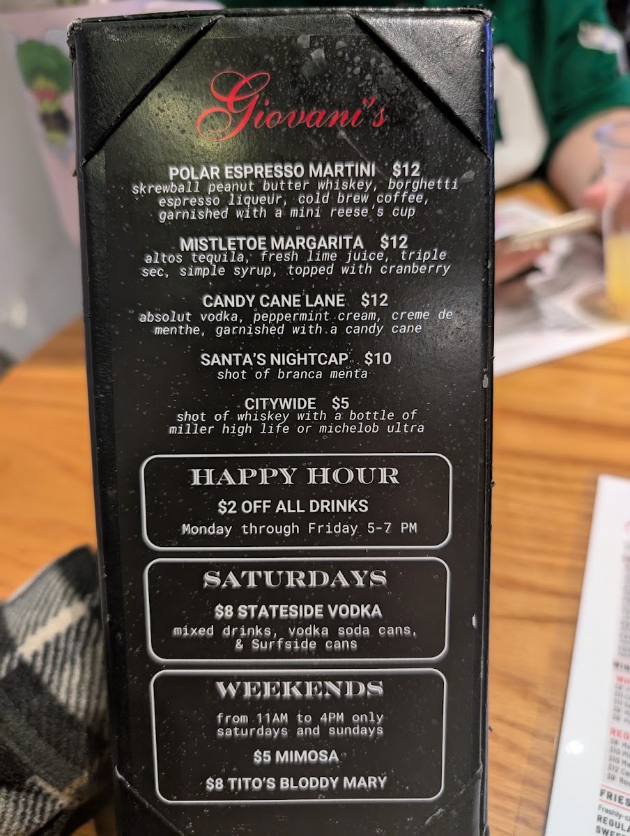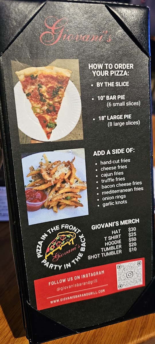 When it comes to drinks, Giovani’s doesn't fall short either. Whether you're looking to unwind with a soda or sip on a refreshing iced tea, the drink menu provides your favorites at pocket-friendly prices. Pair your meal with a cool drink as you enjoy the friendly banter and welcoming service from staff members, exemplified by Amy Alvarado, who lauds their professionalism and attentiveness. It’s this hospitality that truly enhances the experience, ensuring every visit feels like a friendly gathering rather than just a meal.